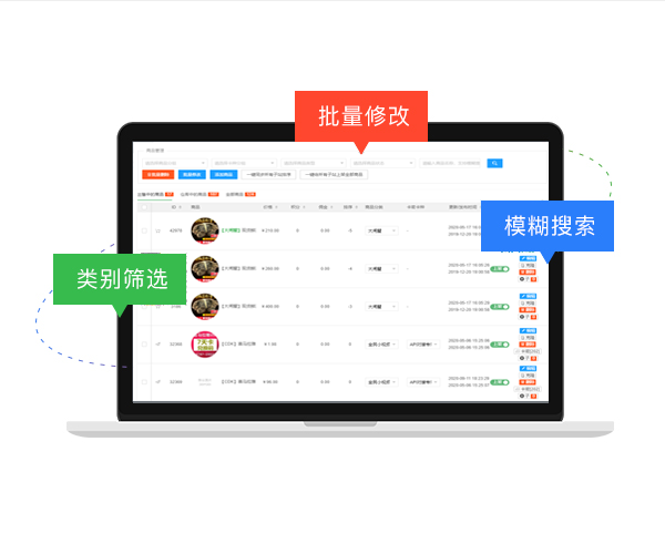 后台可通过商品状态、产品种类等筛选商品,商品可模糊查询